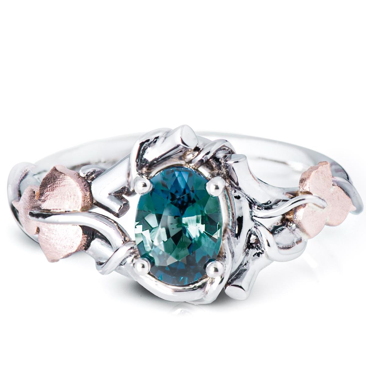 Handmade vines and morning glory leaves ring set with an oval-shaped teal green sapphire.