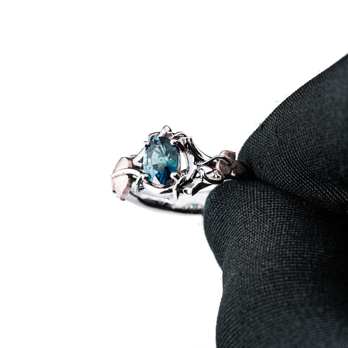 Be the first to review “Black and Rose Gold Vines and Leaves Teal Sapphire Engagament Ring” Cancel reply