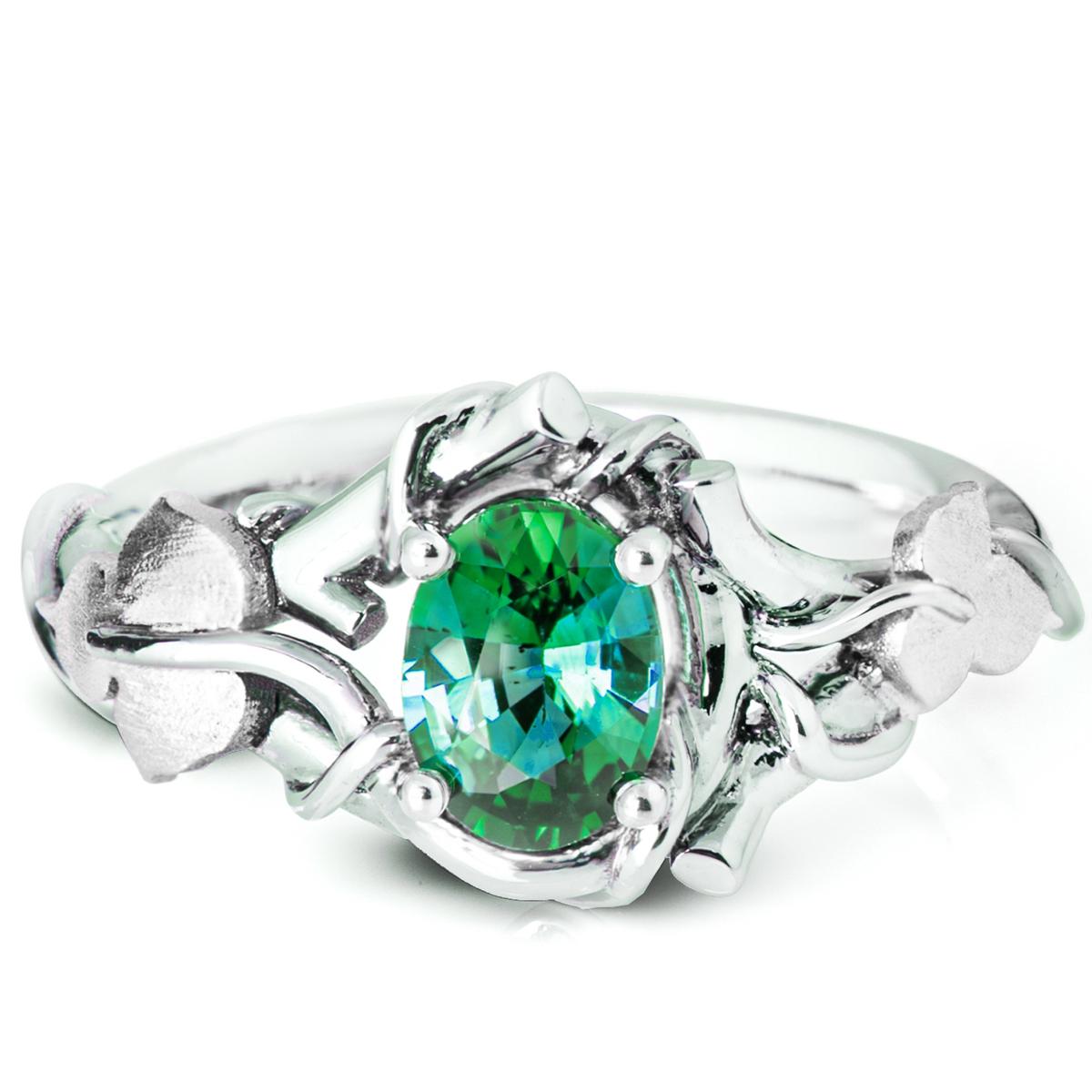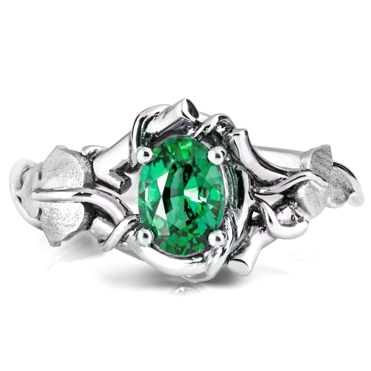 Handmade vines and morning glory leaves ring set with an oval-shaped green emerald.