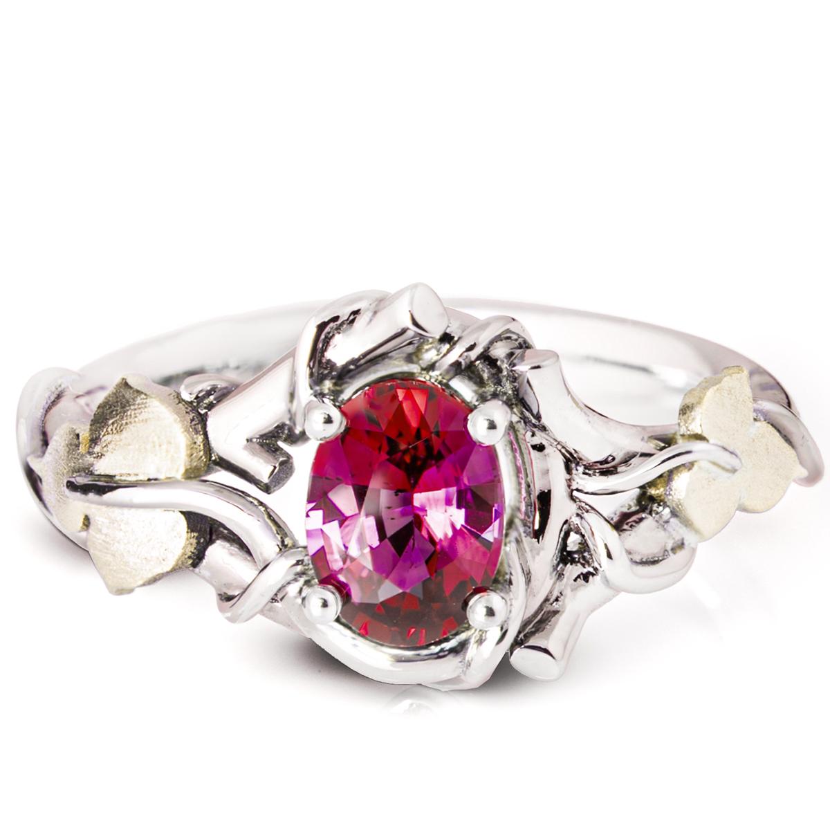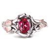 Handmade vines and morning glory leaves ring set with an oval-shaped red ruby.