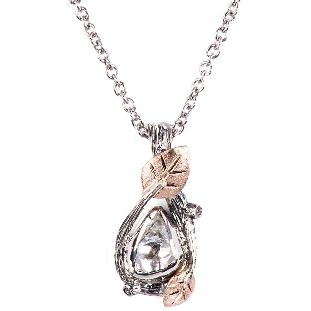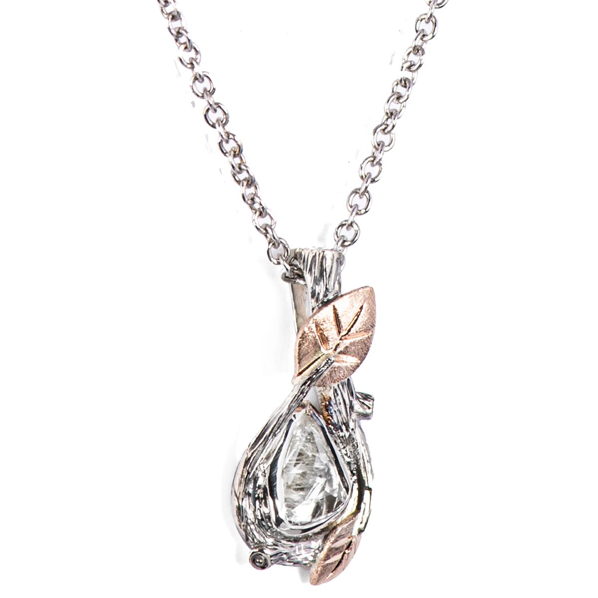 A nature-inspired composition of twig and maple leaf creates a perfect frame for the incredible raw diamond that gleams beautifully, untouched, looking just as it was formed millions of years ago.