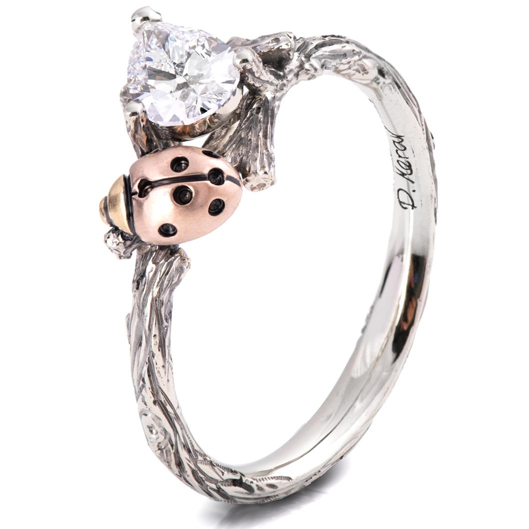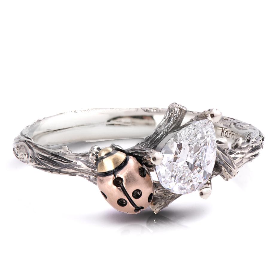 A hand-made twig ring with an elegant, miniature ladybug accenting the center pear-shaped diamond.