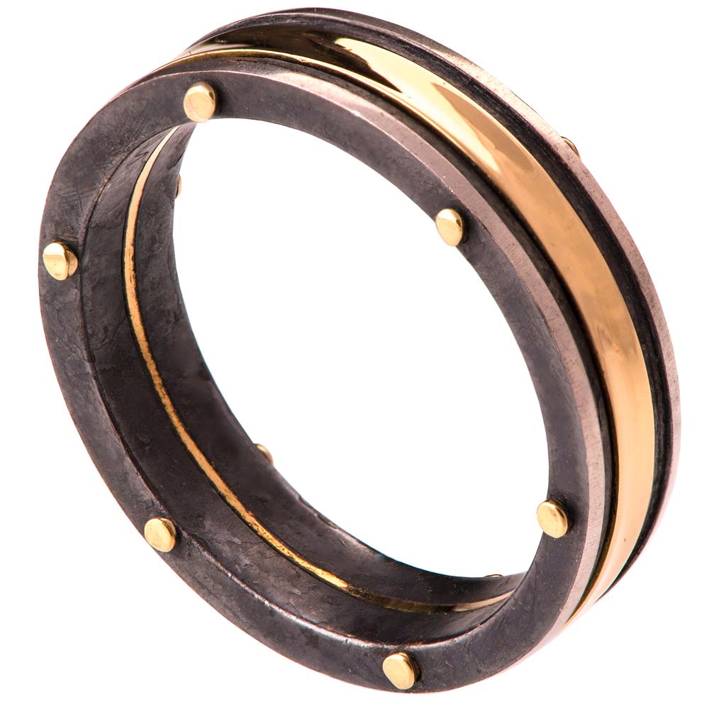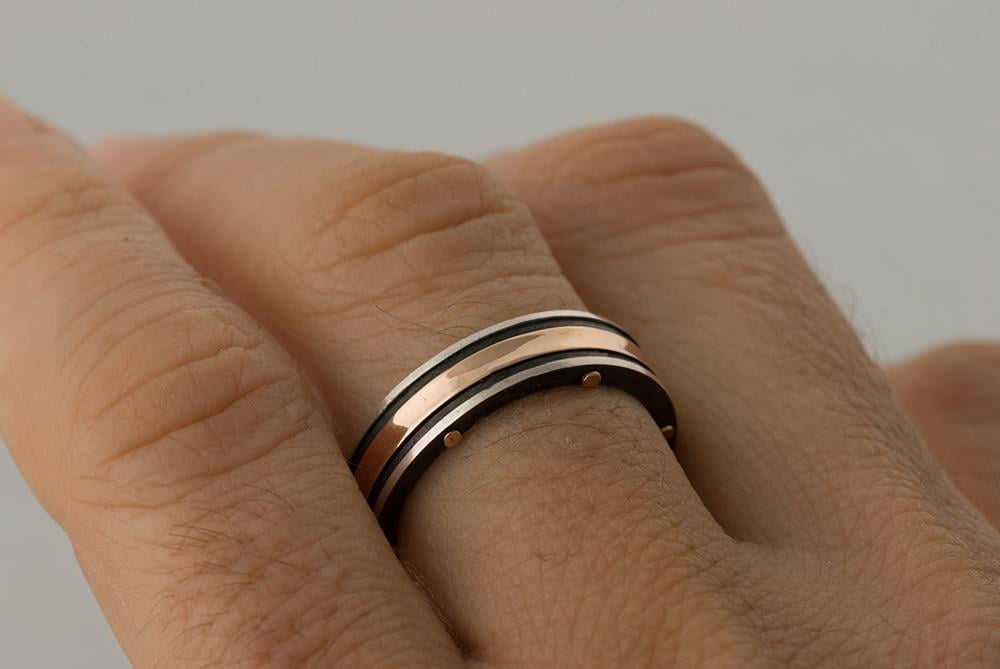 A handmade wedding band made of solid gold and oxidized sterling silver.