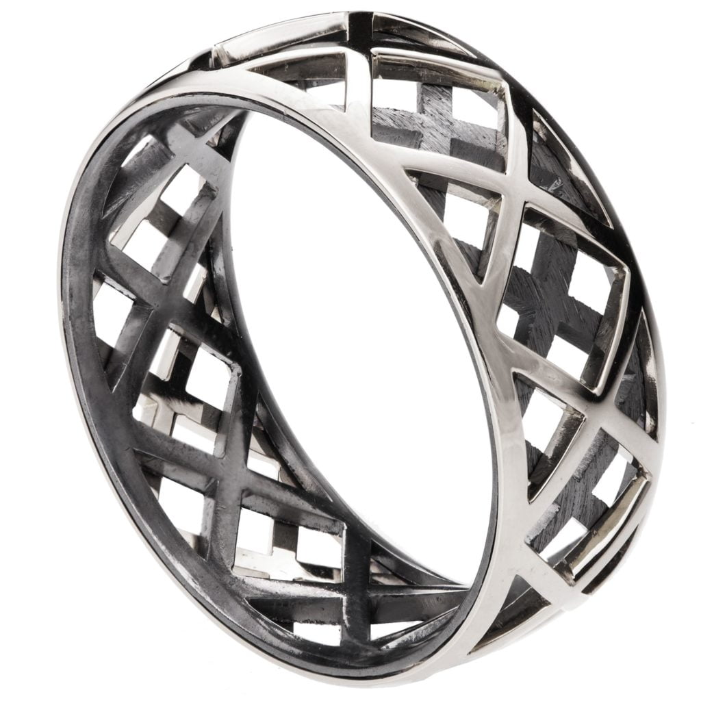 A handmade wedding band made of solid platinumĀ and oxidized sterling silver.