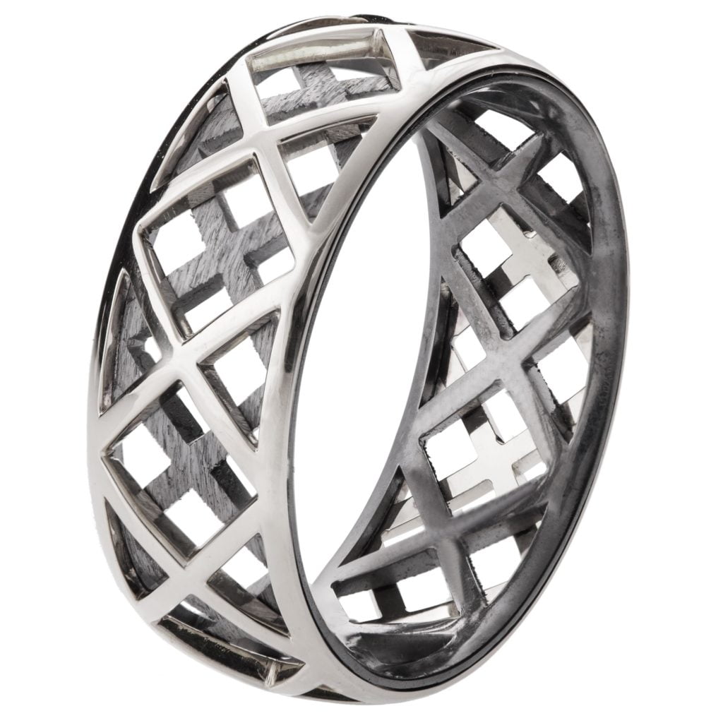 The platinumĀ parts of the ring are brought to a fine shiny finish while the oxidized silver parts are kept in a rough, scratched finish to enhance ring’s character.
