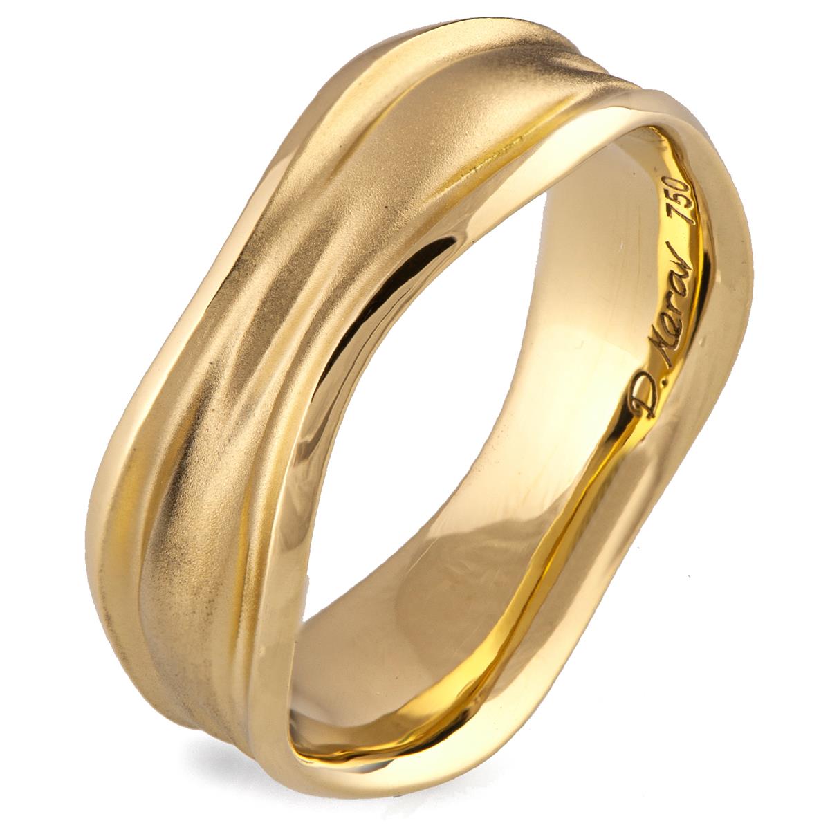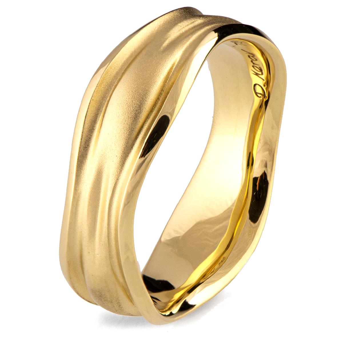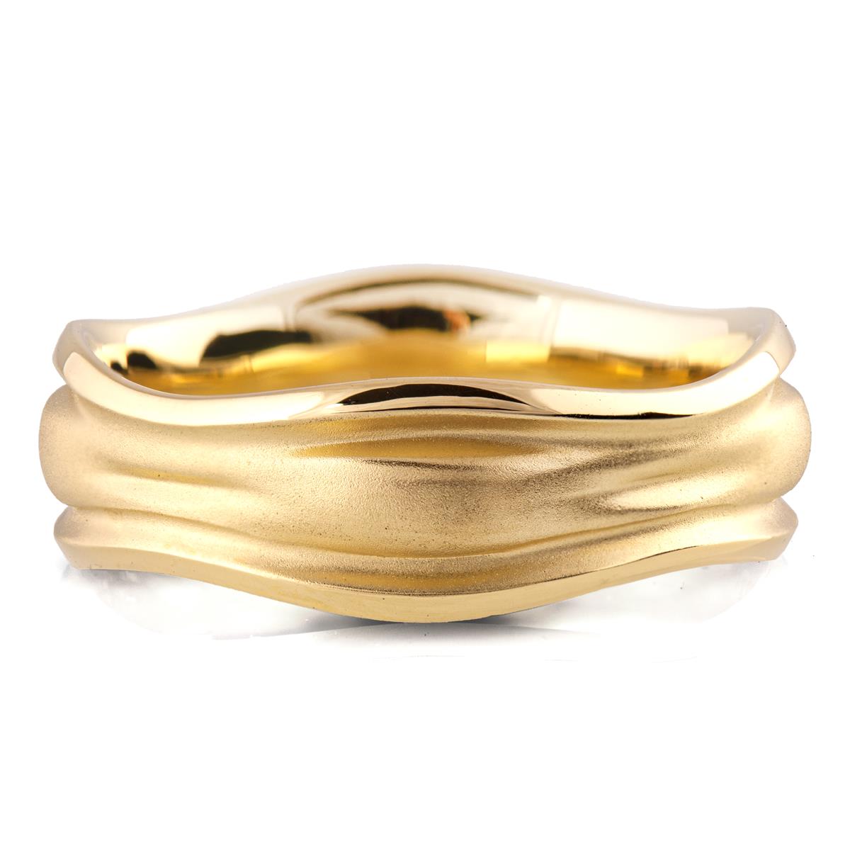 A unique, 7mm wide wedding band with flowing lines and a soft misty design emphasized with a sand-blasted finished center and shiny contours.
