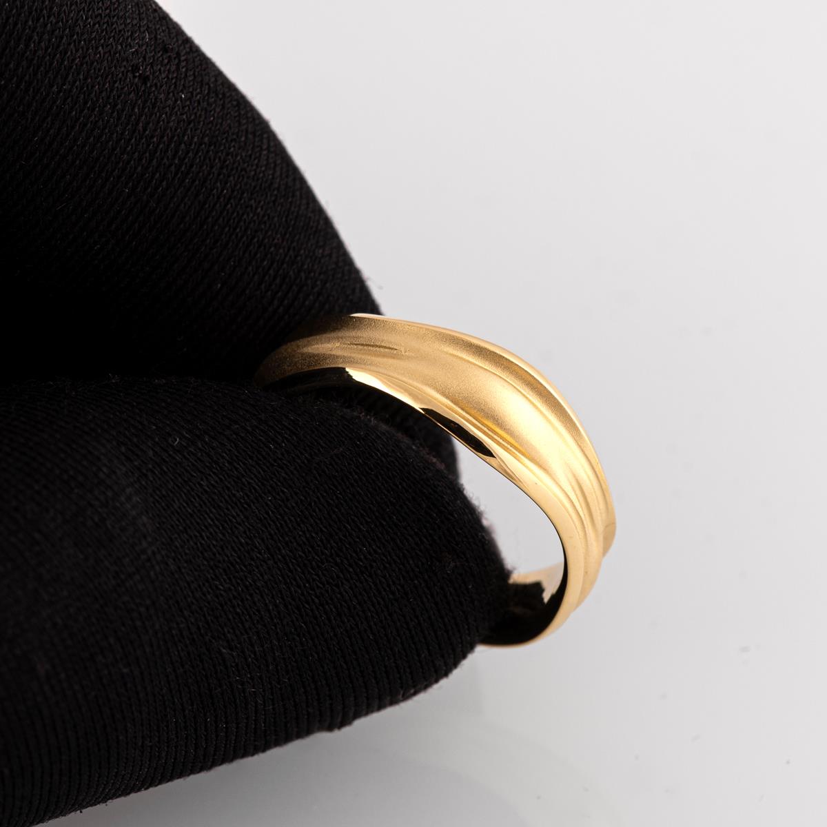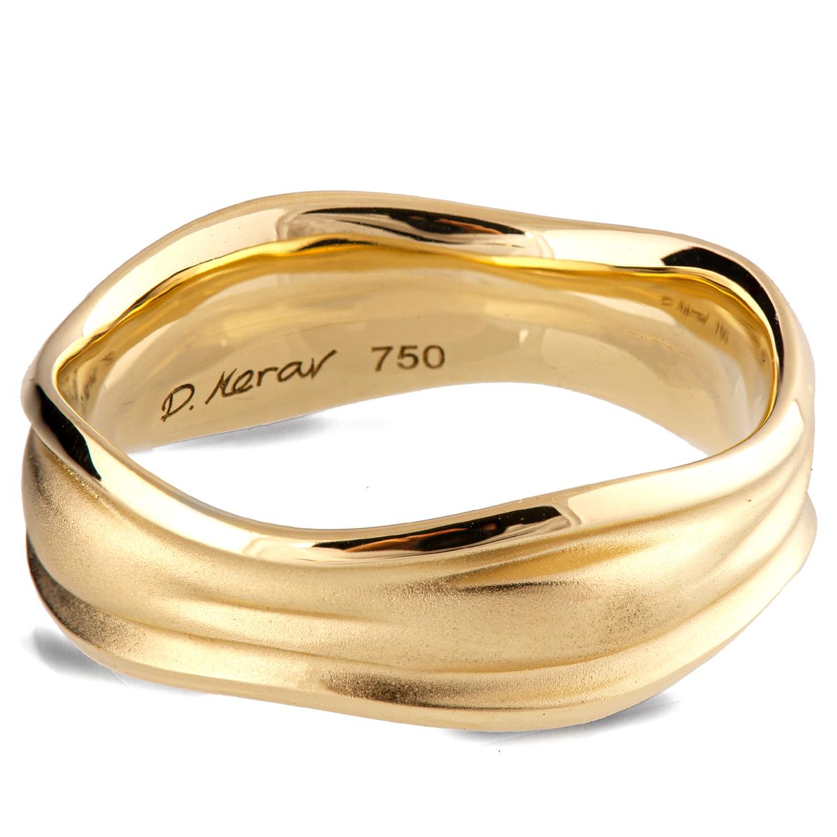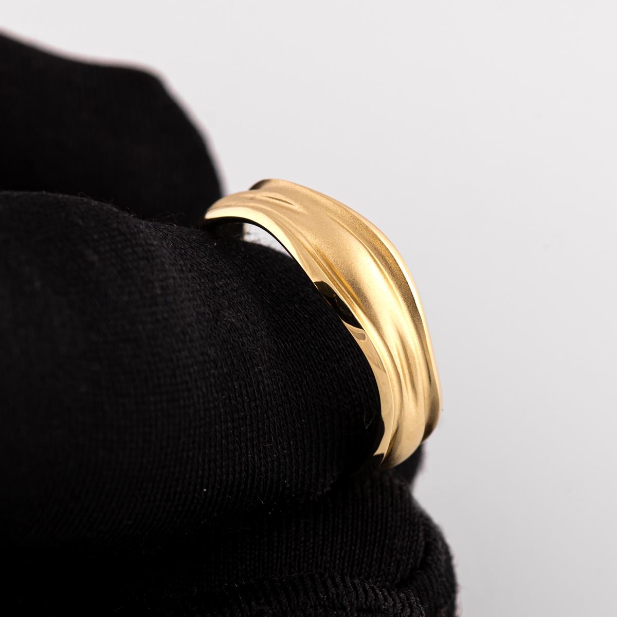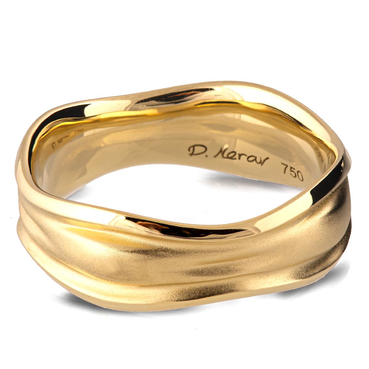 A unique, 7mm wide wedding band with flowing lines and a soft misty design emphasized with a sand-blasted finished center and shiny contours.