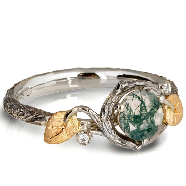 Moss Agate Twig and Leaves Engagement Ring Yellow Gold