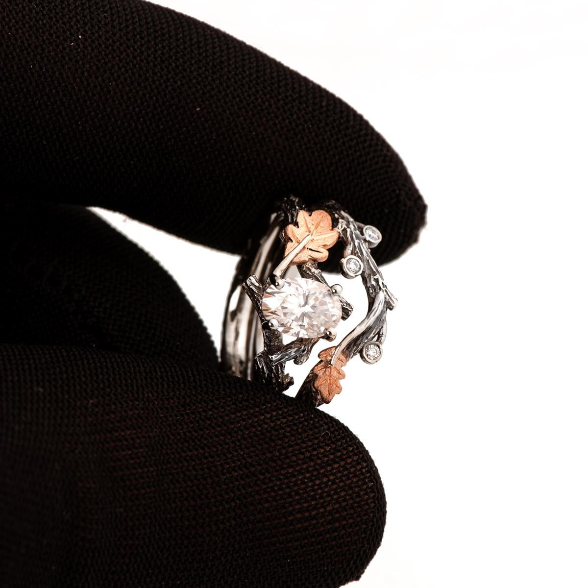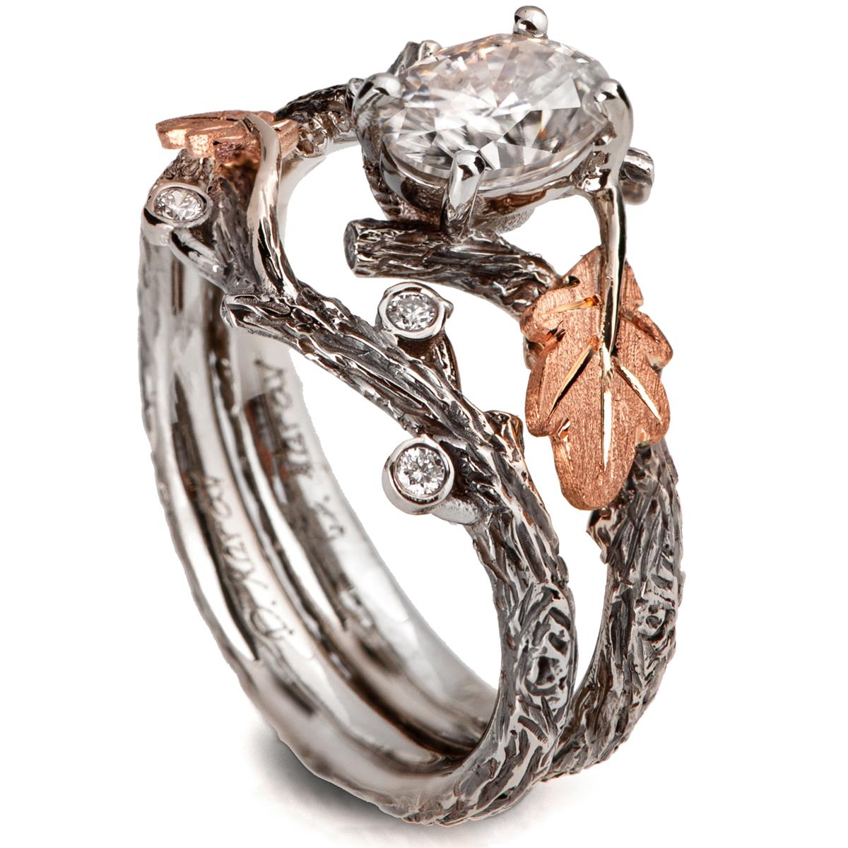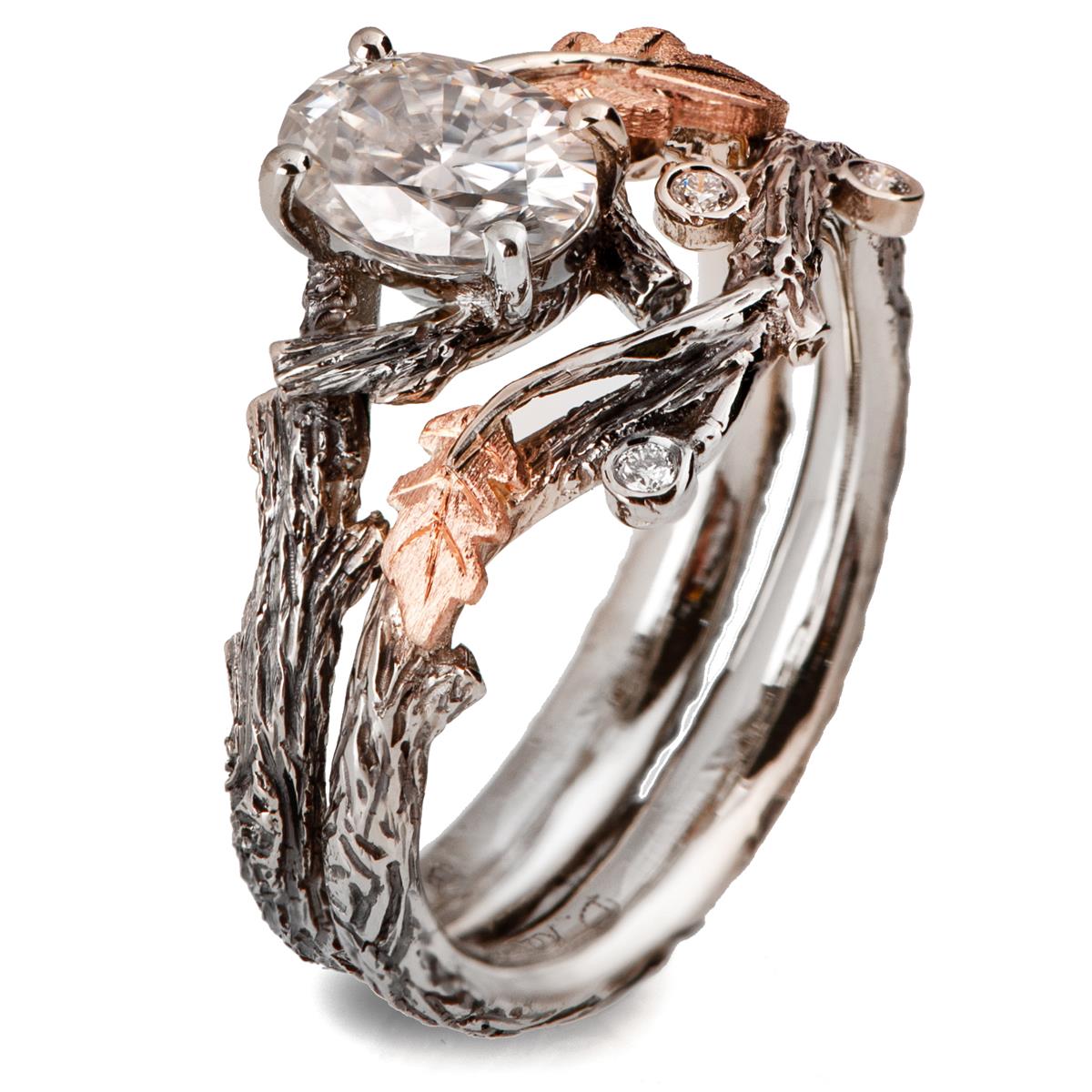 A handmade twig and leaf bridal set made in platinum and rose gold set with oval moissanite.