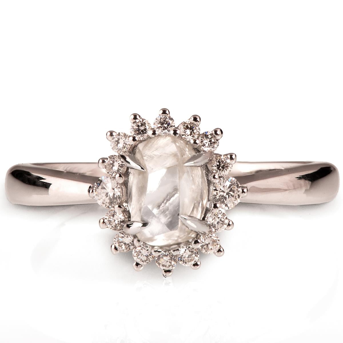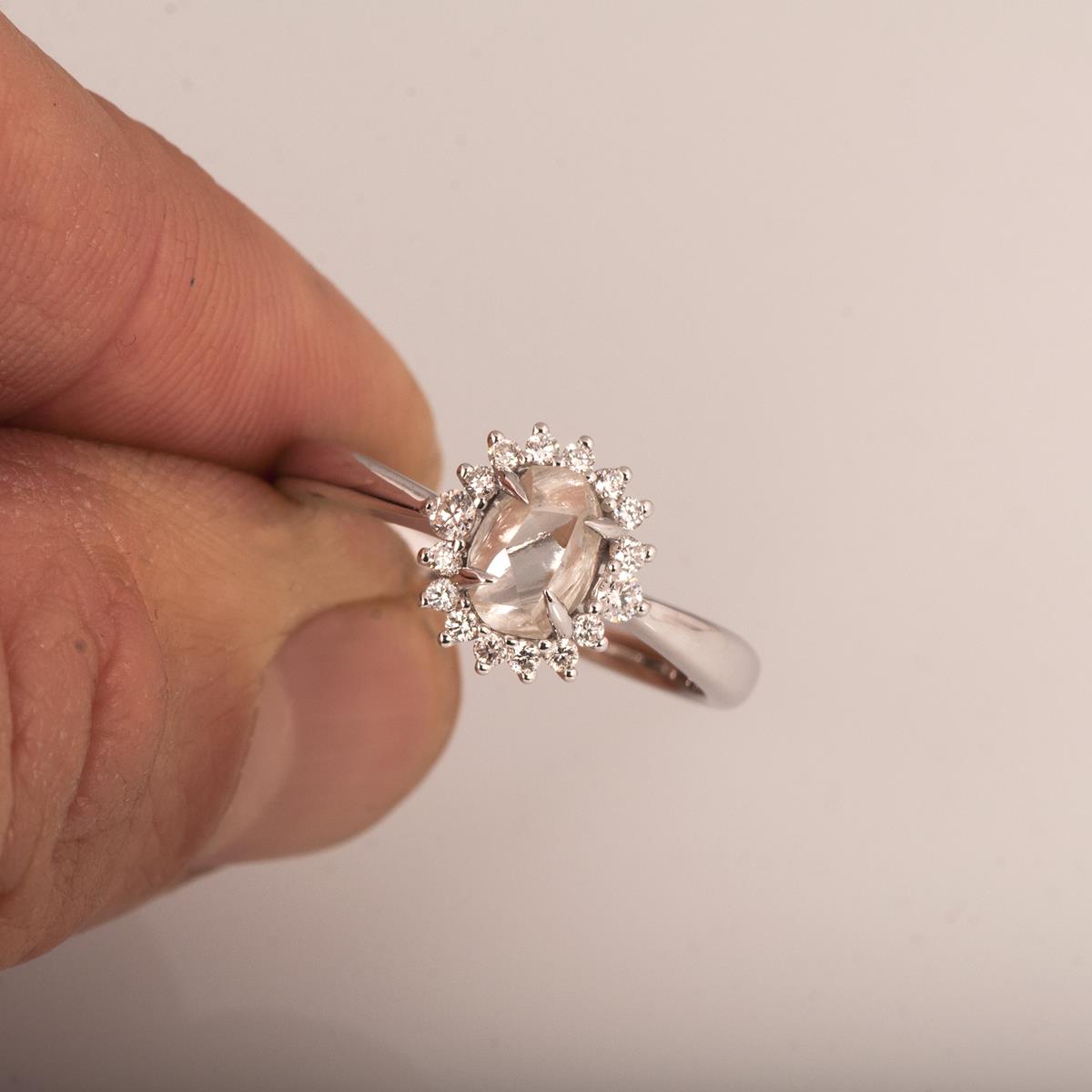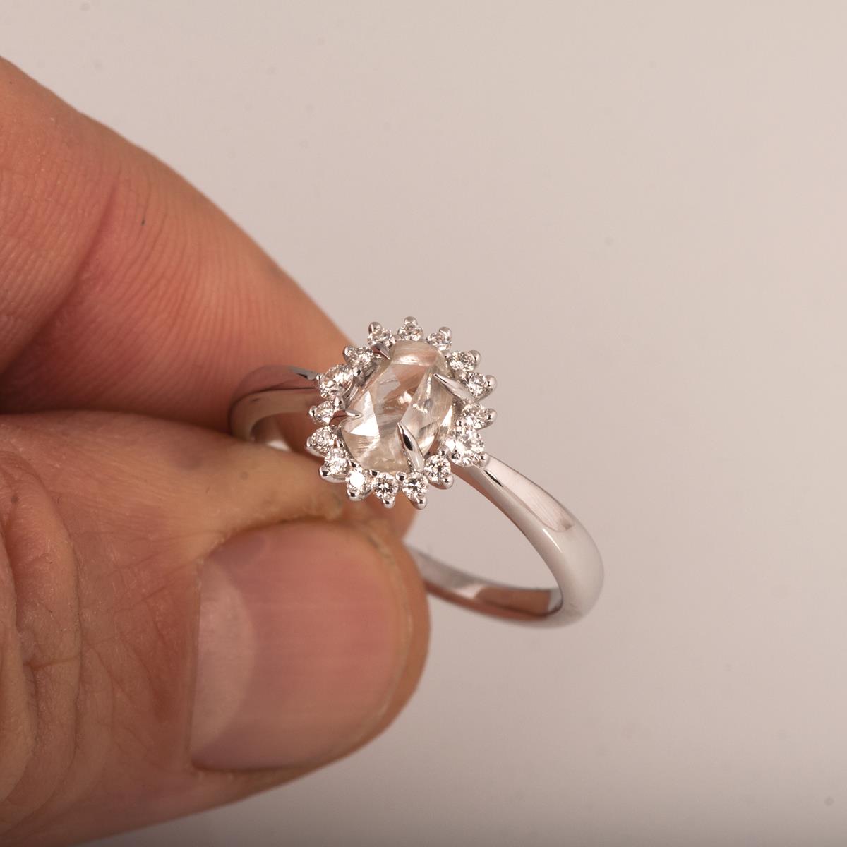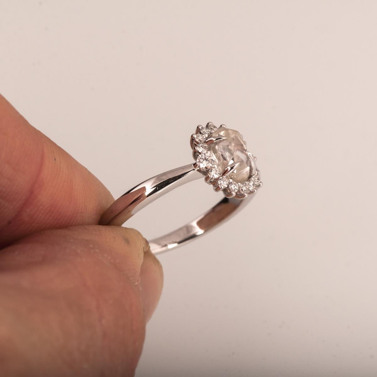 A handmade ring showing a beautiful raw diamond set in claws with a halo of cut diamonds.