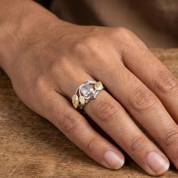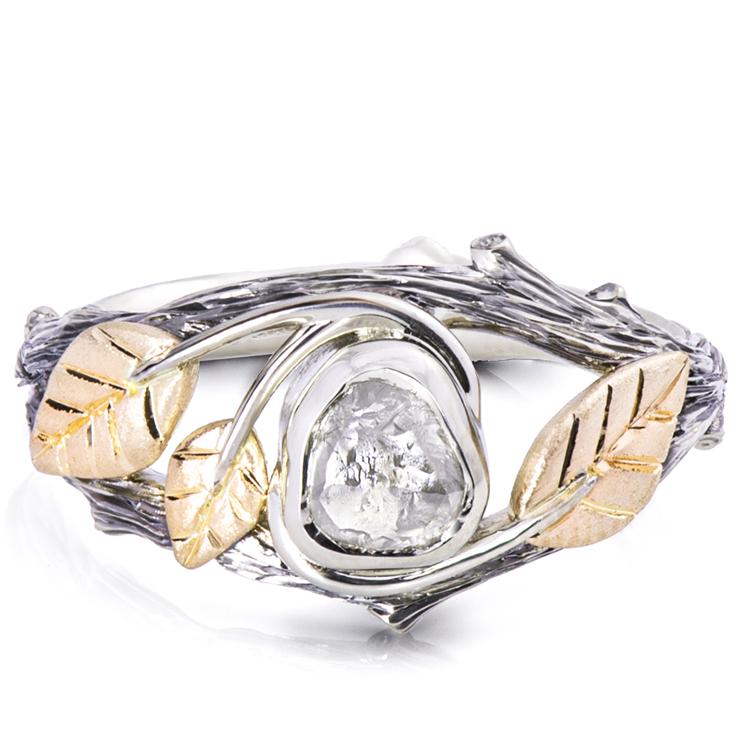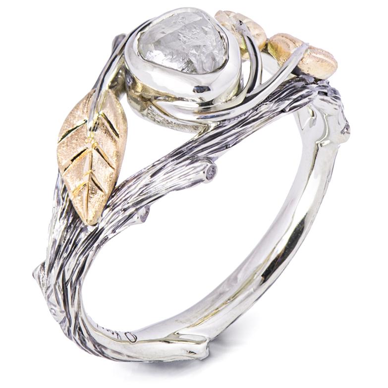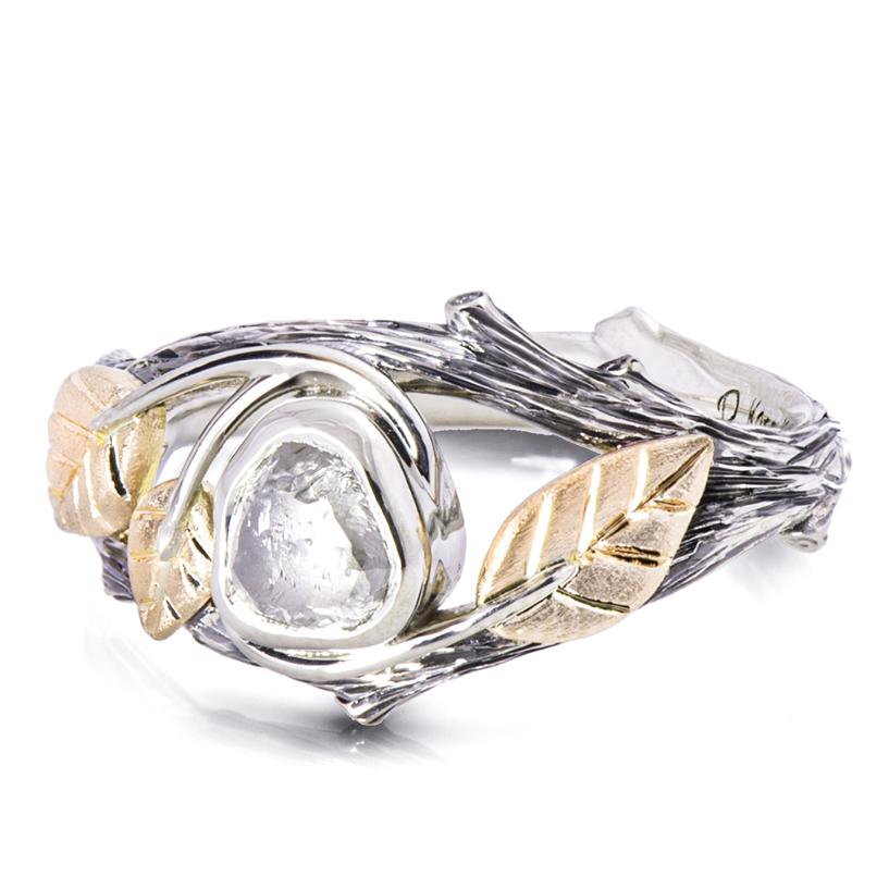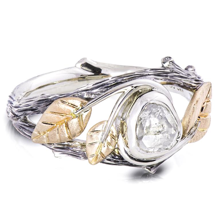 A handmade Twig and leaves ring set with a beautiful raw diamond.