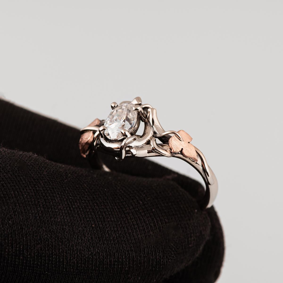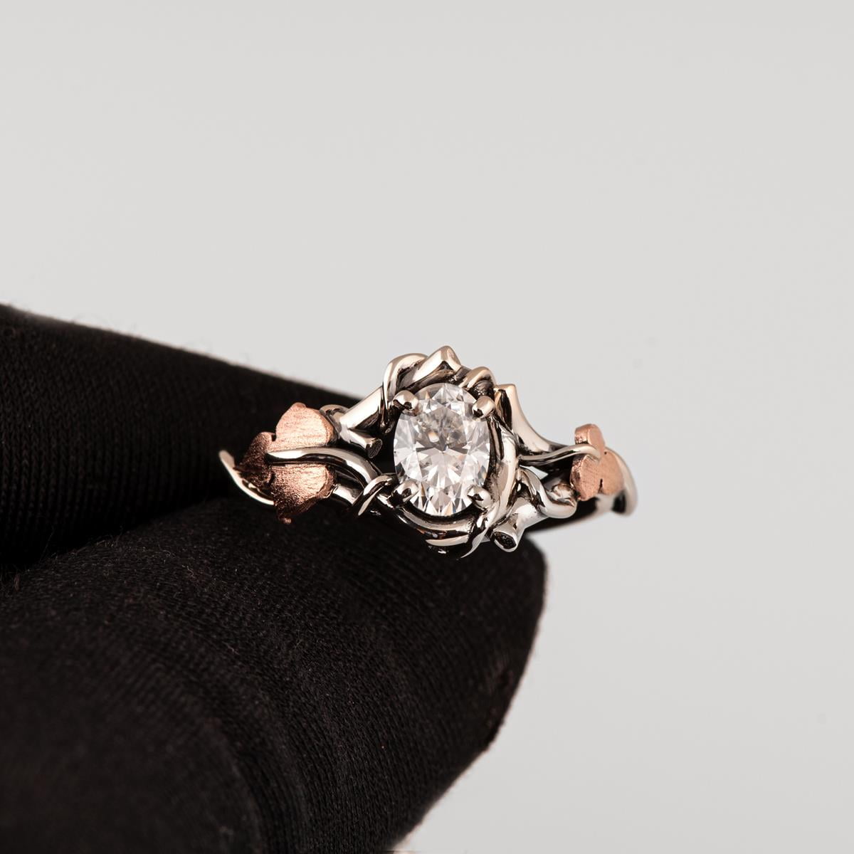 A handmade twig and leaf ring made in white and rose gold, set with a natural, oval white moissanite.