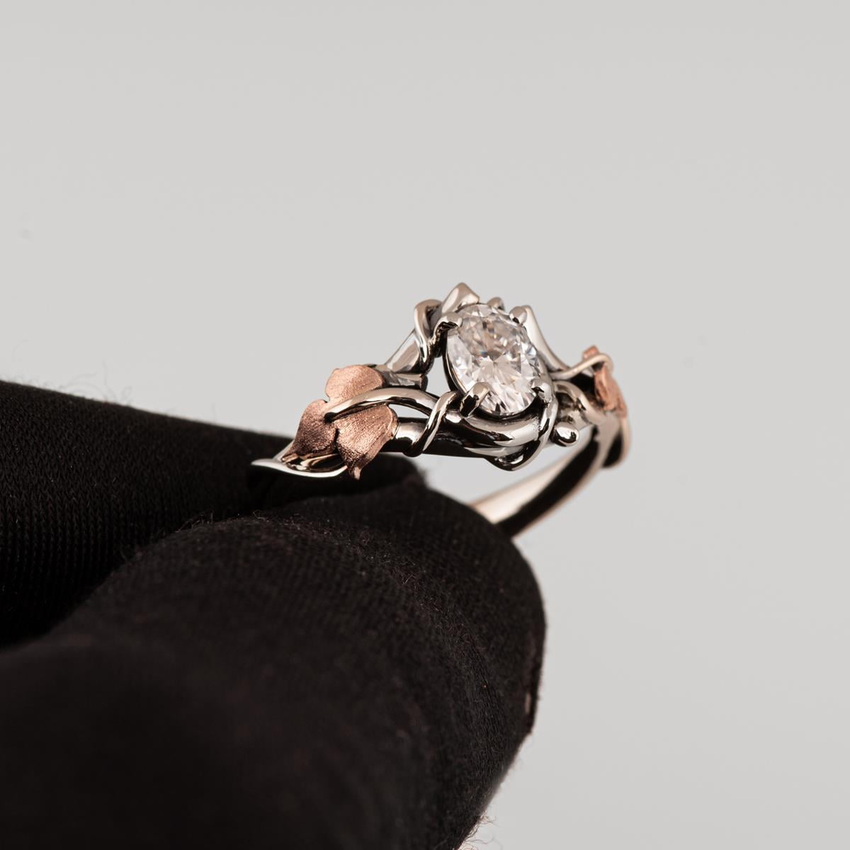 Rose & White Gold Vines and Leaves Oval Moissanite Engagament Ring