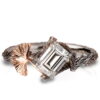 A handmade twig and ginkgo leaf ring made in platinum with a rose gold leaf, set with an emerald-cut diamond.