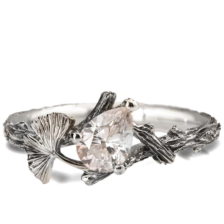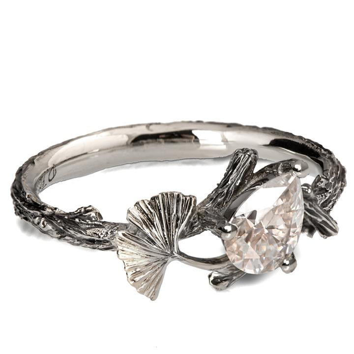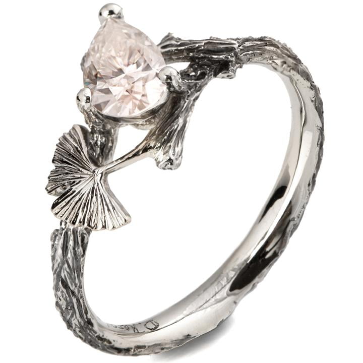 A handmade twig and ginkgo leaf ring made in white gold and set with pear-shaped moissanite.