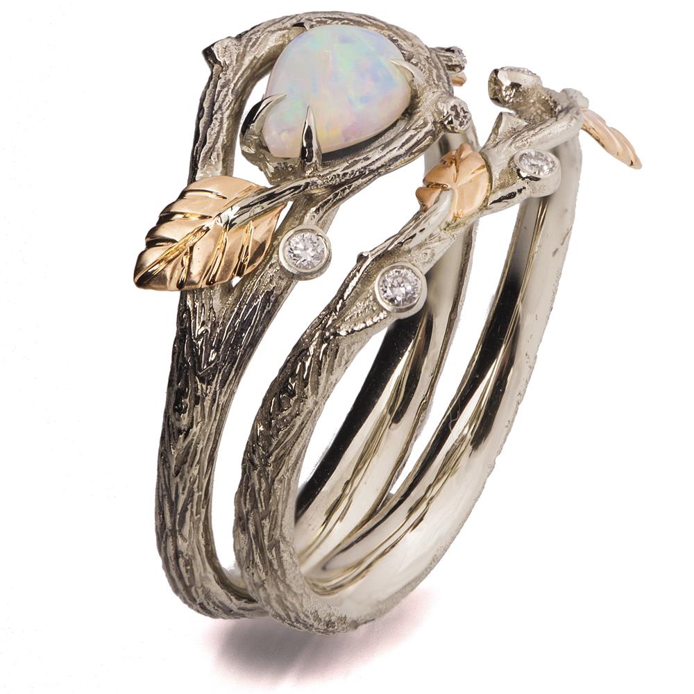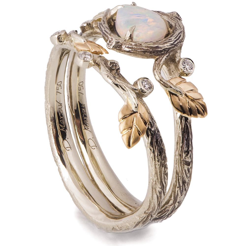 The rings display a natural leaves composition that will slightly change depending on the opal you choose to set in your ring.