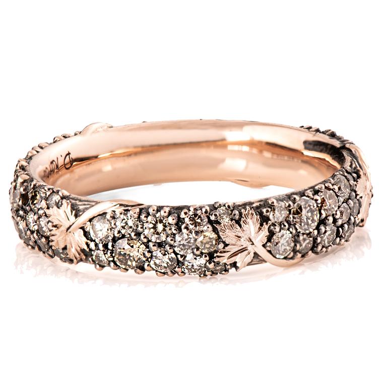 A handmade twig and maple leaf ring set with a variety of white, champagne and chocolate natural diamonds in a complex array of different sizes completing each other and creating a natural, rustic and prestigious look.