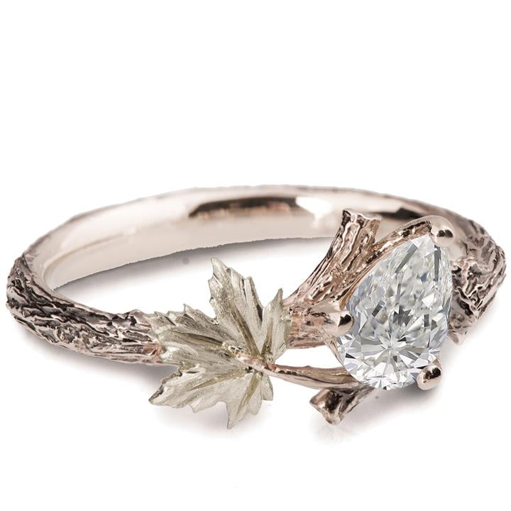 A handmade twig and maple leaf ring made in platinum and set with a pear shaped diamond.