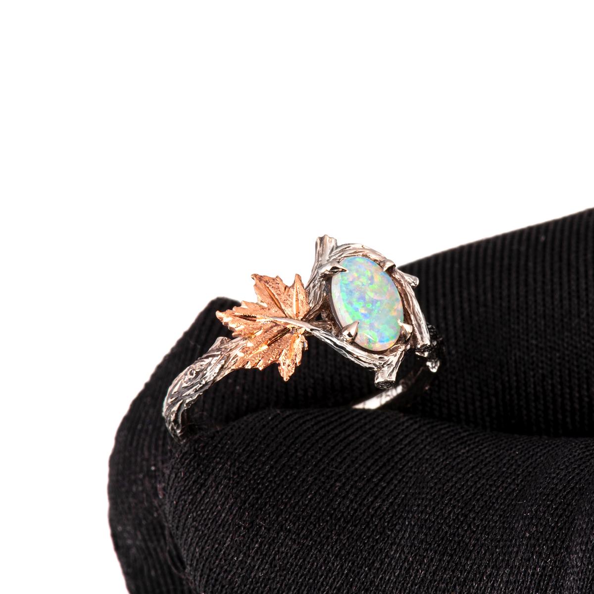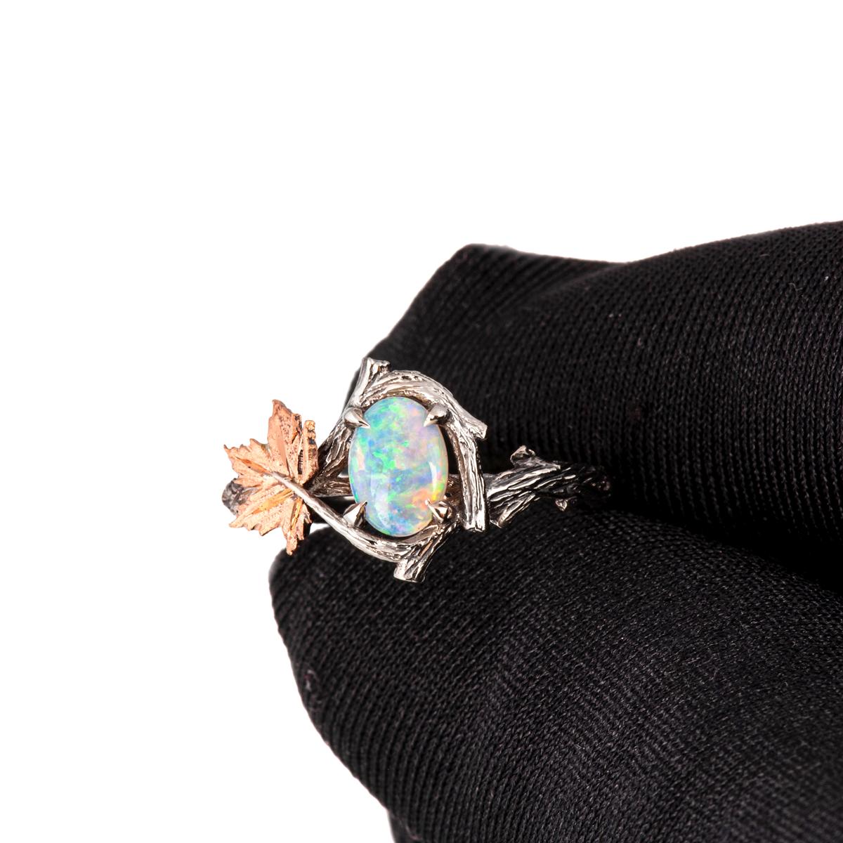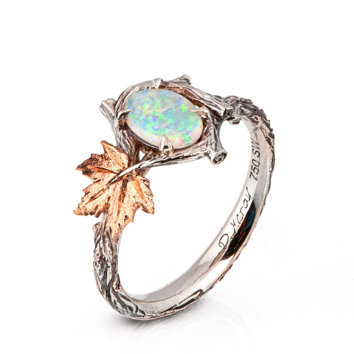 A handmade twig and maple leaf ring set with a beautiful opal of your choosing.