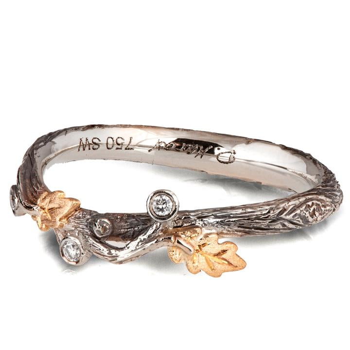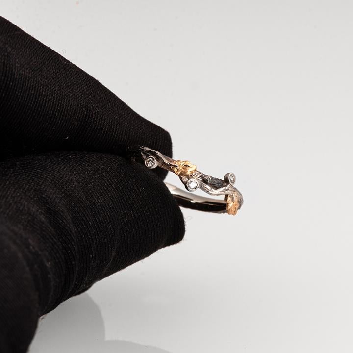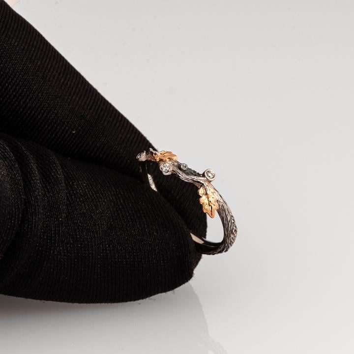 A handmade twig and oak leaf ring made in two gold colors and set with three 1.3mm diamonds.
