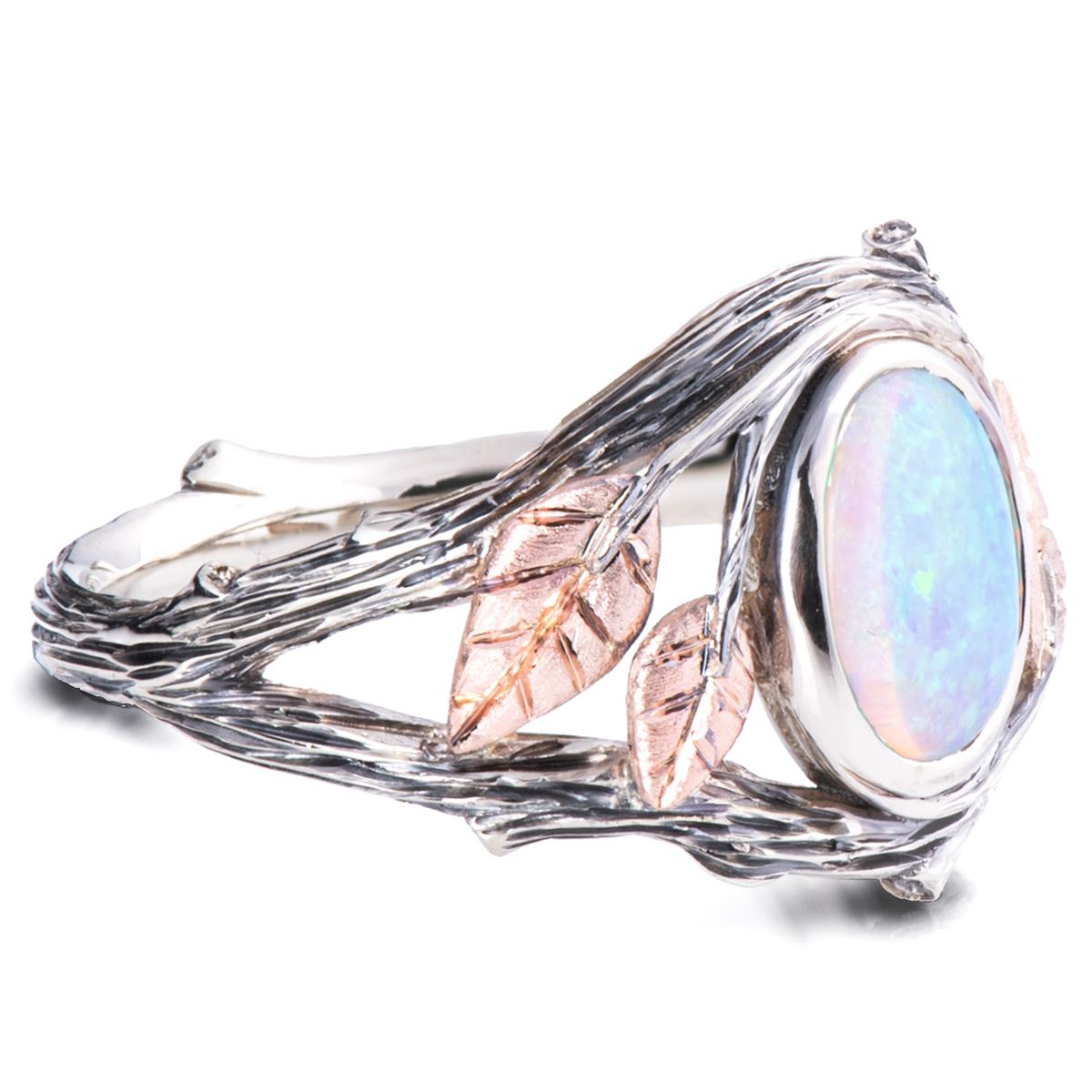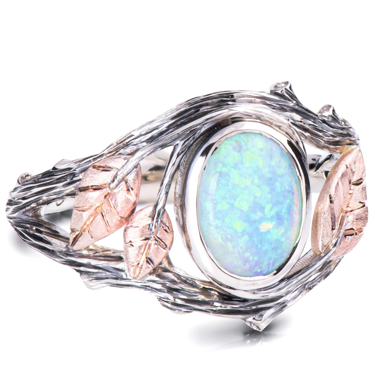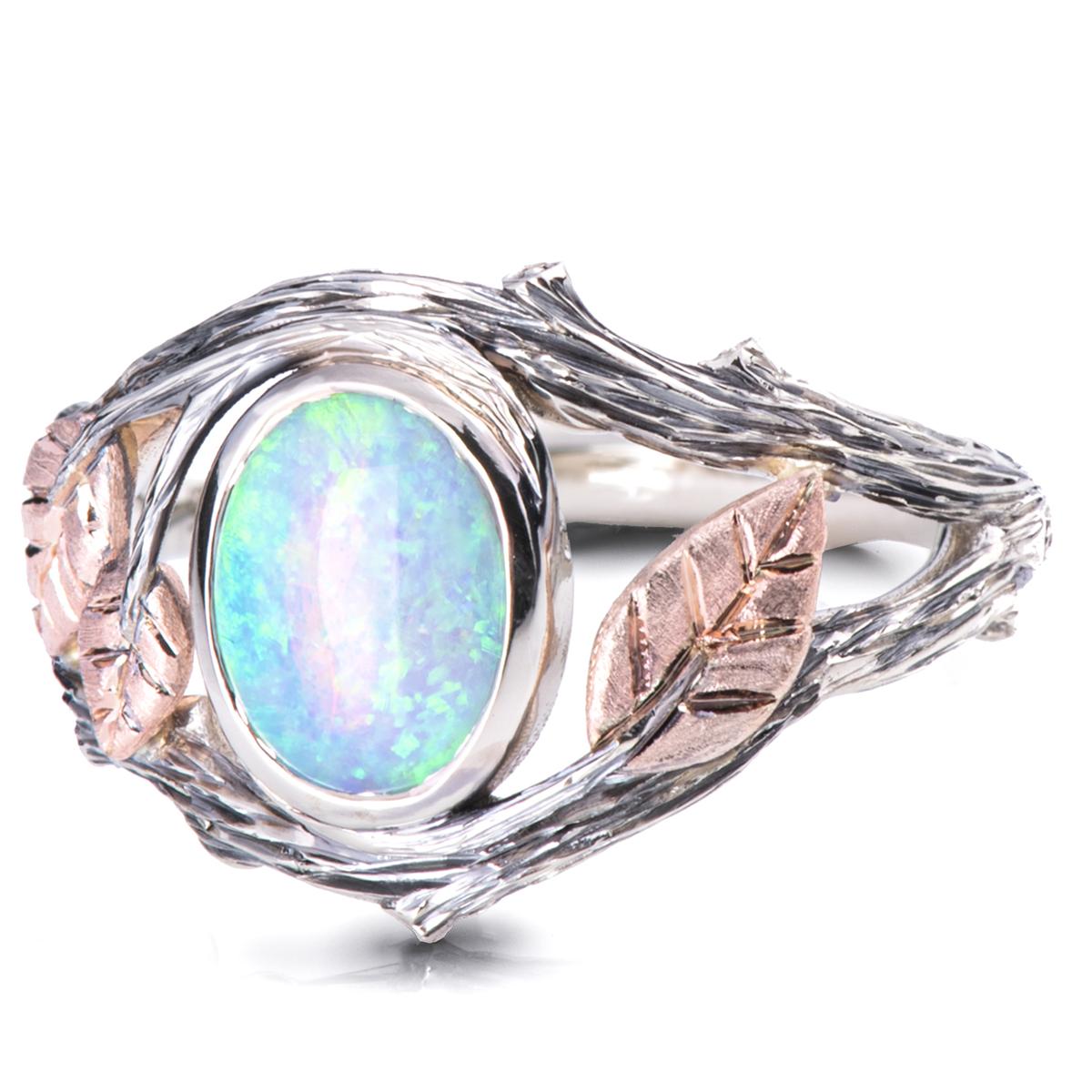 A handmade twig and leaf ring made in two gold colors and set with a beautiful Australian opal of your choosing.