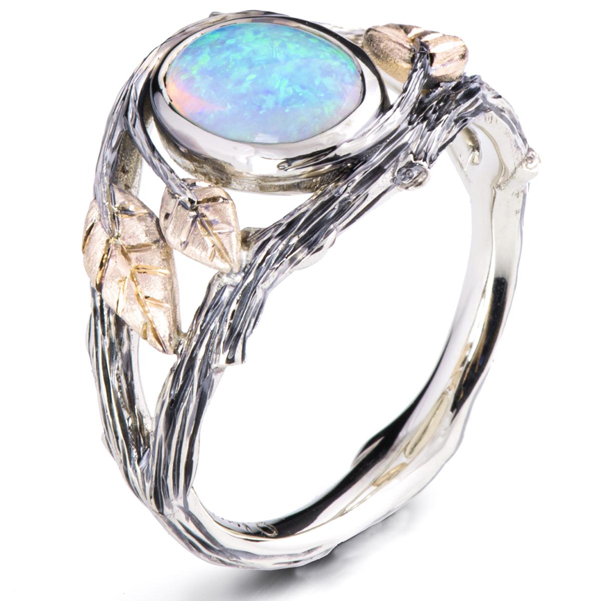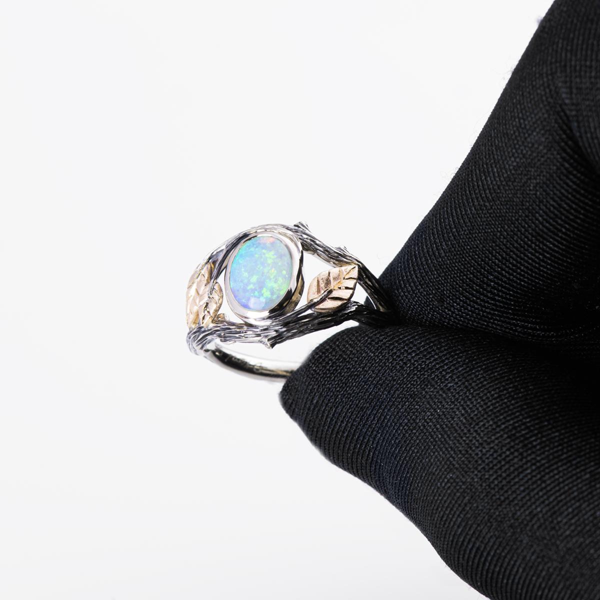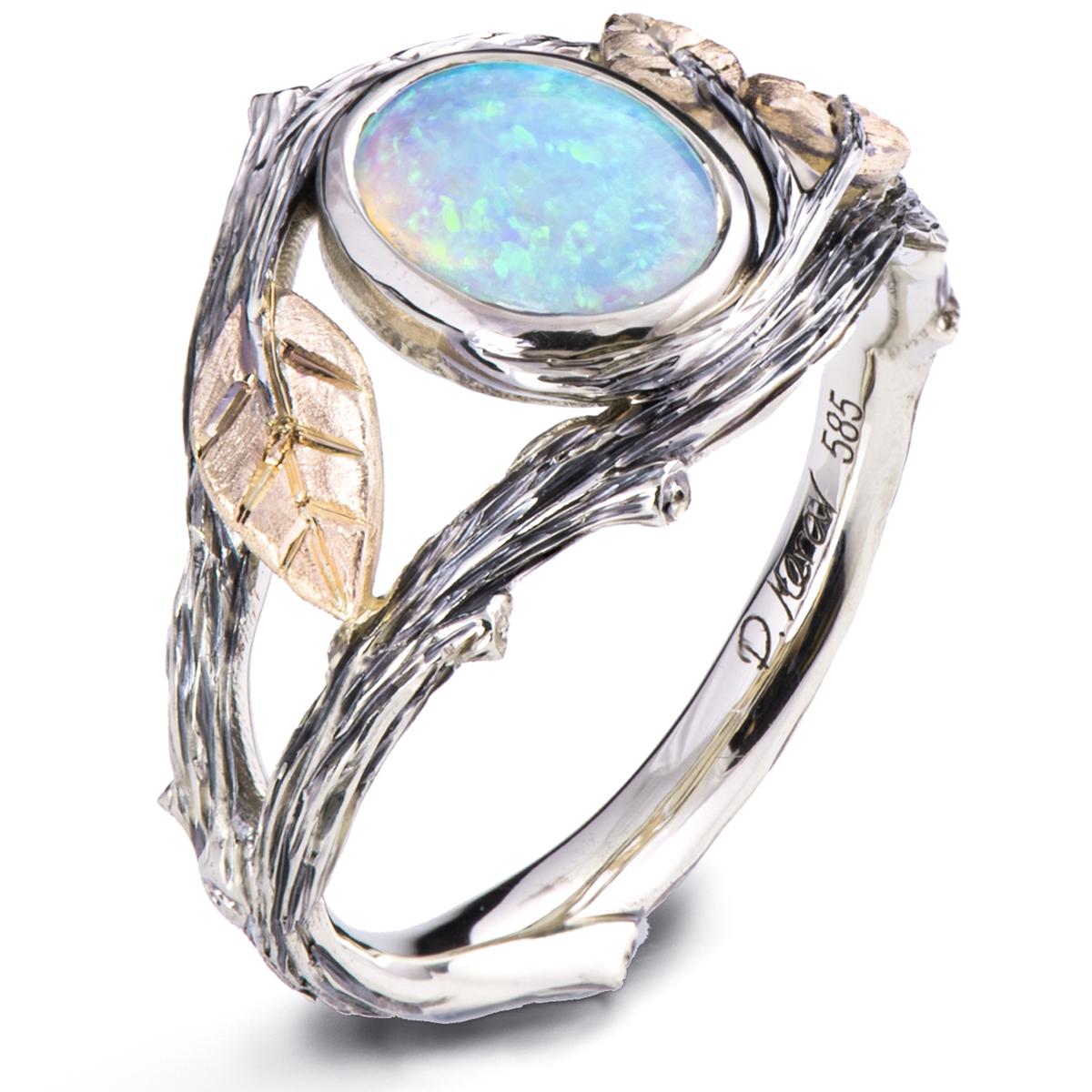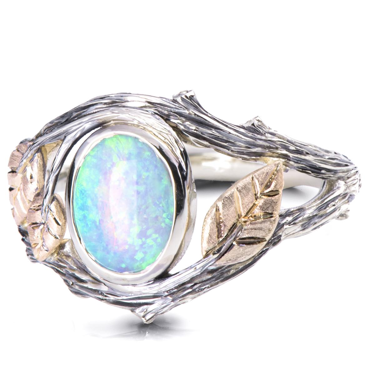 A handmade twig and leaf ring made in two gold colors and set with a beautiful Australian opal of your choosing.